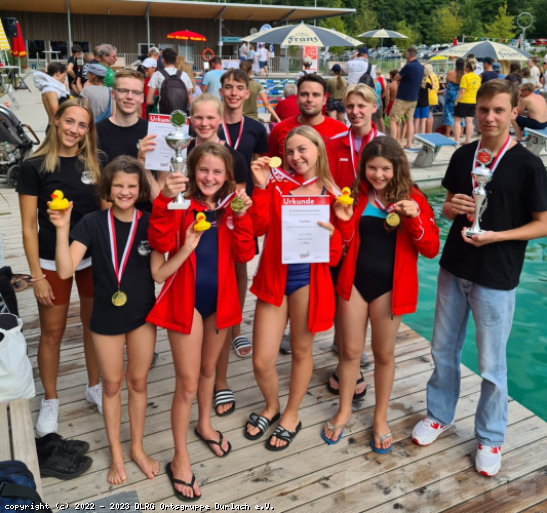 Jugend DurlachVom 07. bis 09. Juli 2023 fanden die Badischen Meisterschaften im Rettungsschwimmen in Bad Dürrheim statt. Auch einige Schwimmer*innen, sowie Mannschaften unserer Ortsgruppe hatten sich zuvor an den Bezirksmeisterschaften dafür qualifiziert und konnten großartige Ergebnisse erschwimmen. Bei den Mannschaftswettkämpfen, die Samstags ausgetragen wurden, konnte die Altersklasse 13/14 weiblich den Titel gewinnen und sich somit direkt für die deutschen Meisterschaften im Herbst qualifizieren. Auch die Altersklasse 17/18 männlich zeigte ihr Können und erkämpfte sich den zweiten Platz. Am Sonntag fanden die Einzelwettkämpfe statt. Hier erkämpften sich Lucius Fondermann und Oliver Rupp den Sieg in ihrer jeweiligen Altersklasse. Den zweiten Platz sichern konnten sich Marlene Landes und Jonatha ... Mehr erfahren
